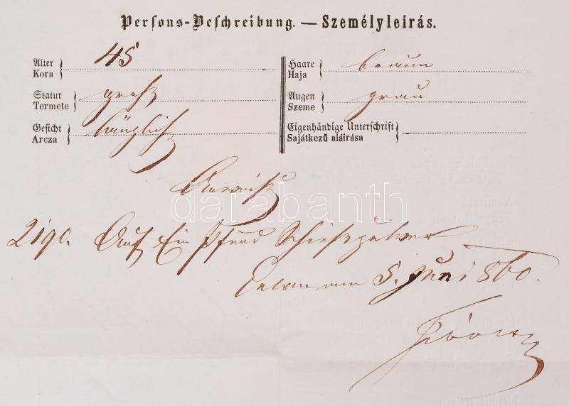1860 Waffenpaß. Fegyvertartási engedély okmánybélyeggel, a pest-budai rendőrség pecsétjével ("K.K. Polizei Direction Ofen Pest") /