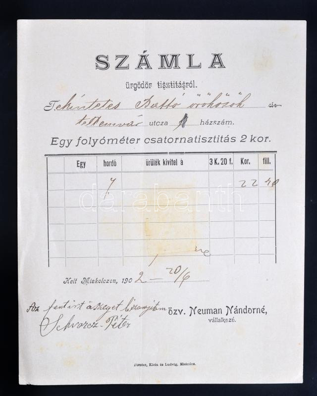 1902 Miskolc számla űrgödör tisztításról https://www.darabanth.com/de/194-Fernauktion/194.0/Andere-Sammelgebiete/Dokument~600022/1902-Miskolc-szamla-urgodor-tisztitasrol~II728912