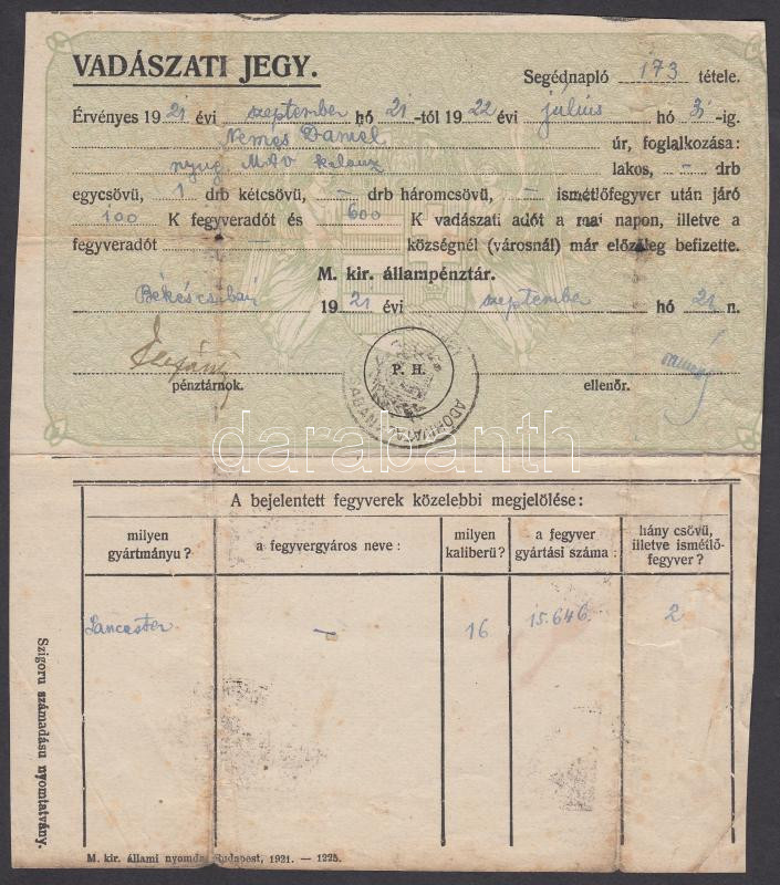 Hunting ticket https://www.darabanth.com/de/194-Fernauktion/194.0/Andere-Sammelgebiete/Dokument~600022/1921-Vadaszati-jegy--3Cbr3EHunting-ticket~II722503