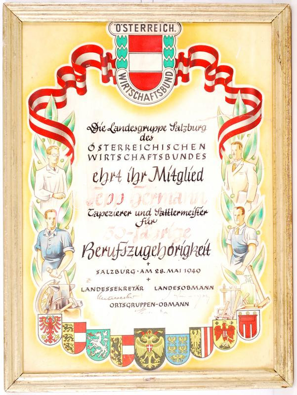 1949 Osztrák szíjgyártó és tapétázó díszoklevél, üvegezett keretben, 4... https://www.darabanth.com/de/194-Fernauktion/194.0/Andere-Sammelgebiete/Dokument~600022/1949-Osztrak-szijgyarto-es-tapetazo-diszoklevel-uvegezett-keretben-40C39730-cm~II709219
