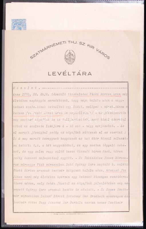 Beschreibung: 6db Okmánybélyeges okirat Szatmárnémetiből, az 1920-40-es évekből