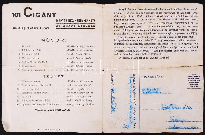 Beschreibung: cca 1940 Budapest Angol Park, térkép műsorismertetővel