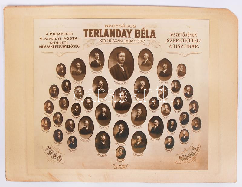1926 A Budapesti M. Királyi Posta Kerületi Műszaki Felügyelőségének tisztikara. Tablókép 42db, nevekkel ellátott portréval, közte Kerny István portréjával, Goszleth István és fia műhelyéből, kartonra kasírozva, 20x23cm (24x31cm)