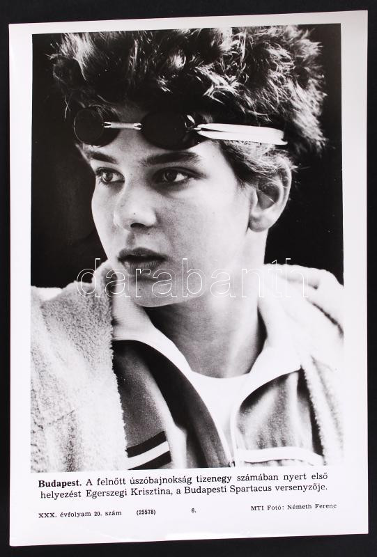 Beschreibung: 1989 Egerszegi Krisztina, aki tizenegy számban nyert első helyezést az országos felnőtt úszóbajnokságon, 26×18 cm