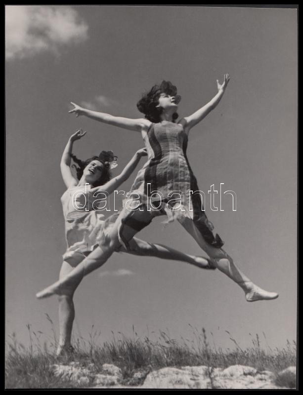 Beschreibung: Cca 1930-1940 Forrai fotó: Szentpál Olga mozgásművészeti iskola növendékeinek szabadtéri felugrása; 22x17 cm