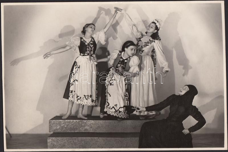 Beschreibung: Cca 1930-1940 Rozgonyi fotó: Szentpál Olga mozgásművészeti iskola növendékeinek színpadi jelenete; pecsételt 14x21 cm;