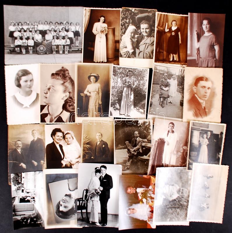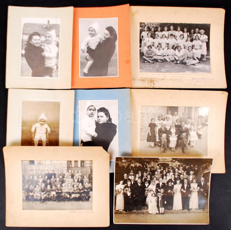 Cca 1940 Margitszigeti laboratórium, 12×17 cm + Cca 1950 Fodrász üzlet személyzete és kirakata, 13×9 cm + 1957 A kiskunhalasi Háziipari Szövetkezet újjáépült csipkeháza, 13×9 cm + Cca 1940 50 db főleg családi fotók + Cca 1930 7 db csoportkép: esküvői, iskolai tablókép, stb, 18×24 cm