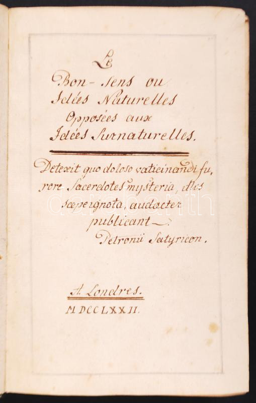 Le Bon-sens ou Jelées Naturelles opposées aux Jelées Surnaturelles. Detexit quo dolos vaticinandi furore Saceredotes mysteria, itilis scepergnota, avdacter publicant Petronii Satyricon A. Londres 1772
