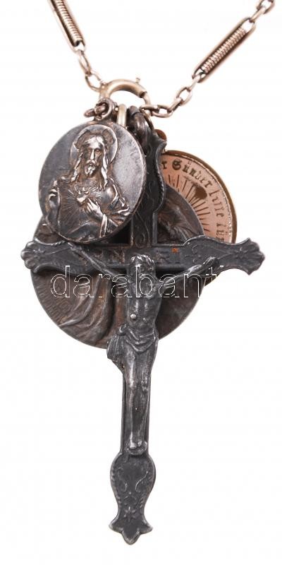 Beschreibung: Míves kidolgozású feszület lánccal, érmékkel + (Ag.) ezüstlánc, nettó: 2,8 g