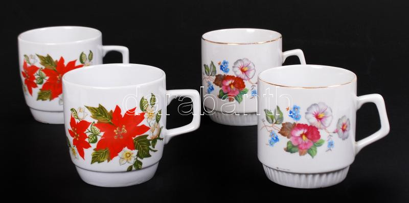 Beschreibung: 4 db Zsolnay kakaós bögre, két fajta matricás díszítéssel, jelzettek, hibátlanok, m:8 cm