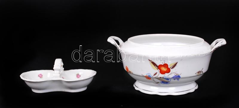 Beschreibung: Zsolnay szószóstál tető nélkül + sótartó, jelzett, matricás, m:9 cm, h:12 cm