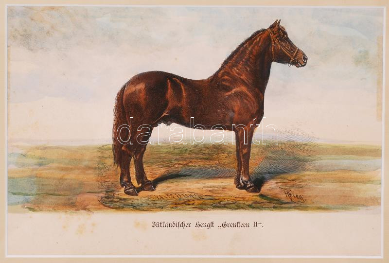 Beschreibung: 1879 Futamgyőztes lovak sorozat: színezett kőnyomat igényes üvegezett keretben / Champion horses lithography 40x33 cm