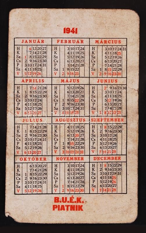 1941 Piatnik kártyanaptár, sarka tépett https://www.darabanth.com/de/194-Fernauktion/194.0/Andere-Sammelgebiete/Werbungen~600030/1941-Piatnik-kartyanaptar-sarka-tepett~II742256