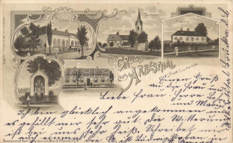 Arbesthal, school, church, post, litho https://www.darabanth.com/de/194-Fernauktion/194.0/Ansichtskarten/Osterreich~600046/Arbesthal-school-church-post-litho~II742767