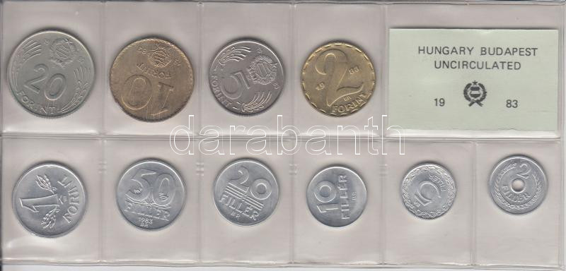 1983. 2f-20Ft 10db klf érmés forgalmi sor fóliatokban T:1 https://www.darabanth.com/de/194-Fernauktion/194.0/Numismatik/Ungarische-Munzen~200007/1983-2f-20Ft-10db-klf-ermes-forgalmi-sor-foliatokban-T1~II737948