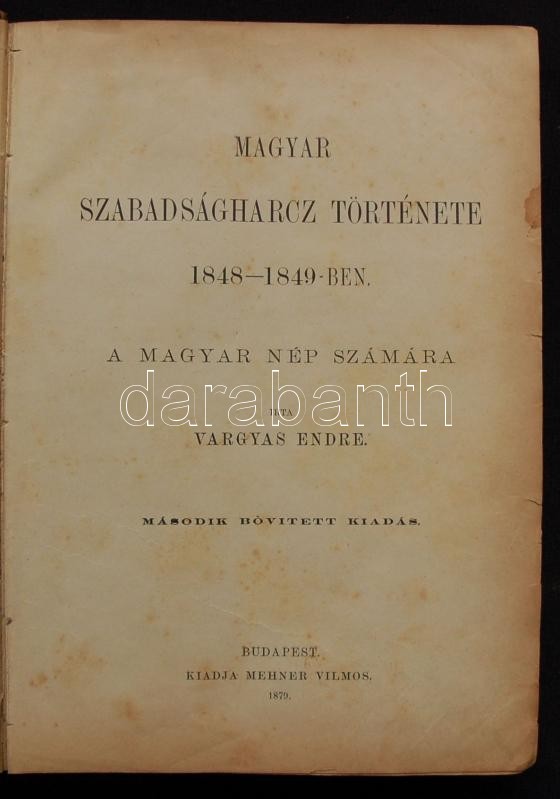 Vargyas Endre: Magyar szabadságharcz története 1848-1849-ben. A magyar nép számára. 2. bőv. kiadás. Mehner Vilmos, Bp, 1879. Viseltes félbőr kötésben, márványozott lapszélekkel, illusztrációkkal