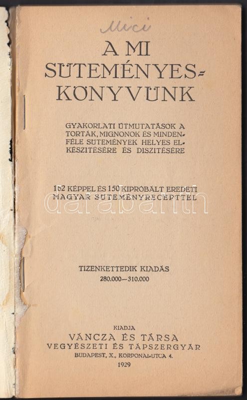 A mi süteményes könyvünk. Bp., 1929, Váncza és Társa. Kiadói papírköté... https://www.darabanth.com/de/195-Fernauktion/195.0/Andere-Sammelgebiete/Bucher-Kuche-und-Garten~800030/A-mi-sutemenyes-konyvunk-Bp-1929-Vancza-es-Tarsa-Kiadoi-papirkotesben~II745016