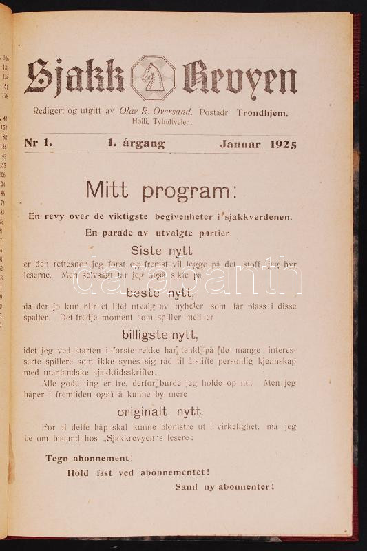 1925... https://www.darabanth.com/de/195-Fernauktion/195.0/Andere-Sammelgebiete/Bucher-Sonstige-Raritaten~800039/1925-Norveg-sakkfolyoirat-indulo-evfolyama-Felvaszon-kotesben--3Cbr3E1925-Sjakk-Reyvyen-No~II748157