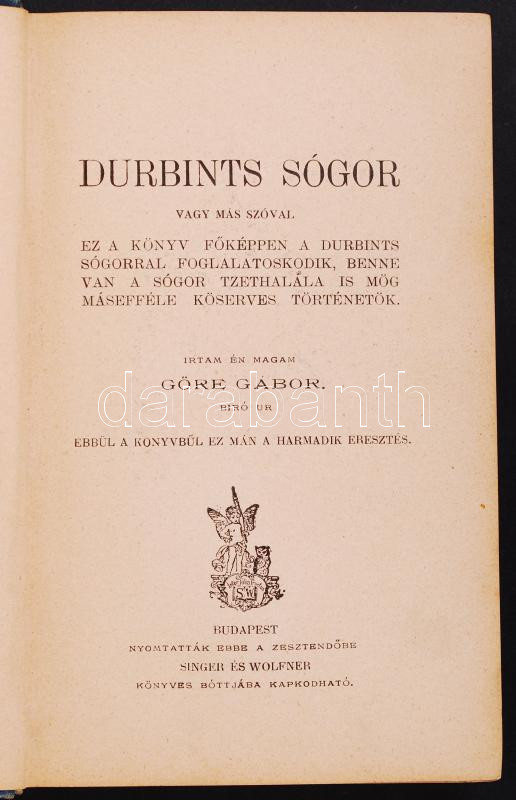 Göre Gábor (Gárdonyi Géza): Durbints sógor. Bp. é.n., harmadik kiadás.... https://www.darabanth.com/de/195-Fernauktion/195.0/Andere-Sammelgebiete/Bucher-Sonstige-Raritaten~800039/Gore-Gabor-Gardonyi-Geza-Durbints-sogor-Bp-en-harmadik-kiadas-Eredeti-vaszonkotes~II748242