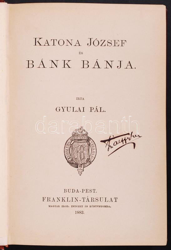 Gyulai Pál: Katona József és Bánk bánja. Bp. 1883. Franklin. Eredeti, ... https://www.darabanth.com/de/195-Fernauktion/195.0/Andere-Sammelgebiete/Bucher-Sonstige-Raritaten~800039/Gyulai-Pal-Katona-Jozsef-es-Bank-banja-Bp-1883-Franklin-Eredeti-aranyozott-vaszonkotes~II748255