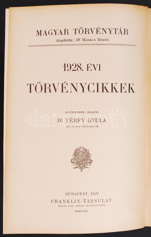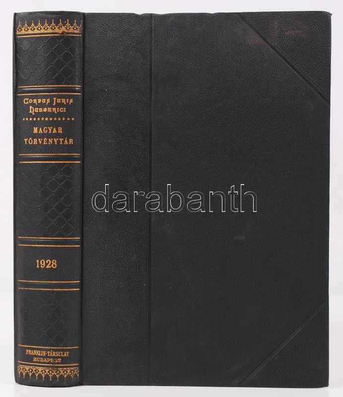 Magyar törvénytár. Corpus Juris Hungarici. Millenniumi emlékkiadás 1928. évi törvények pótlásokkal. Bp., 1929, Franklin-Társulat. Aranyozott gerincű egészvászon kötésben