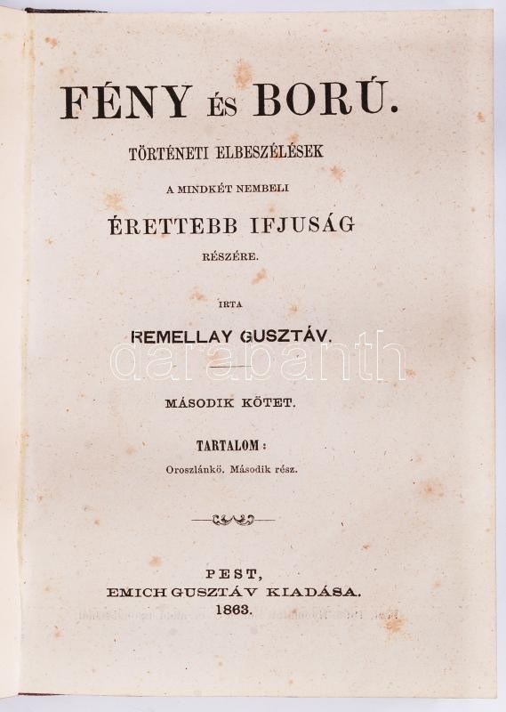 Remellay Gusztáv: Fény és ború. Történeti elbeszélések a mindkét nembeli érettebb ifjúság részére, I-II. kötet. Pest, 1863, Emich Gusztáv. Litografált címképekkel Pataki József nyomdájából. Újrakötve félvászon kötésben, festett lapszélekkel. Kötés kopottas, de egyébként jó állapotú