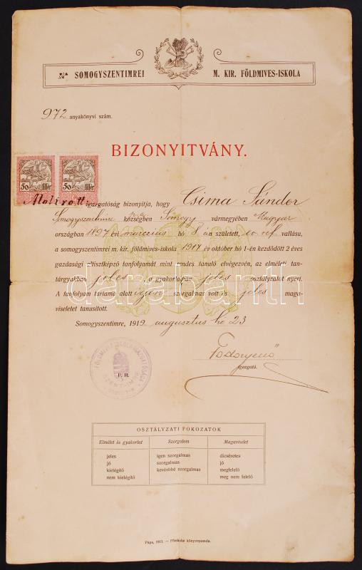 1919 A somogyszentimrei földműves iskola bizonyítványa https://www.darabanth.com/de/195-Fernauktion/195.0/Andere-Sammelgebiete/Dokument~800014/1919-A-somogyszentimrei-foldmuves-iskola-bizonyitvanya~II749079