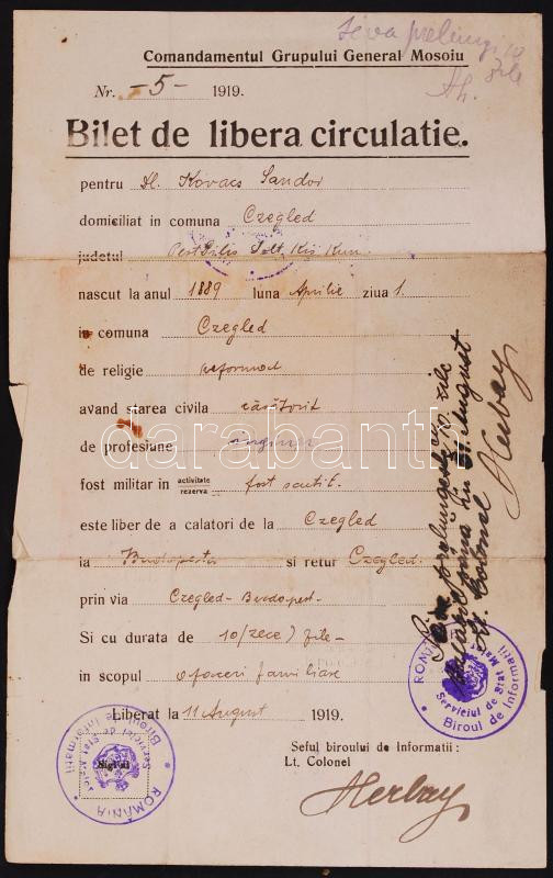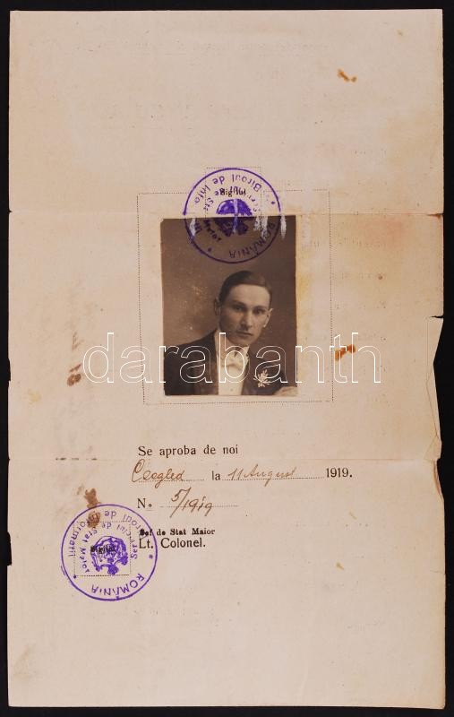 1919 Román igazolvány, Cegléd, fényképes https://www.darabanth.com/de/195-Fernauktion/195.0/Andere-Sammelgebiete/Dokument~800014/1919-Roman-igazolvany-Cegled-fenykepes~II750058