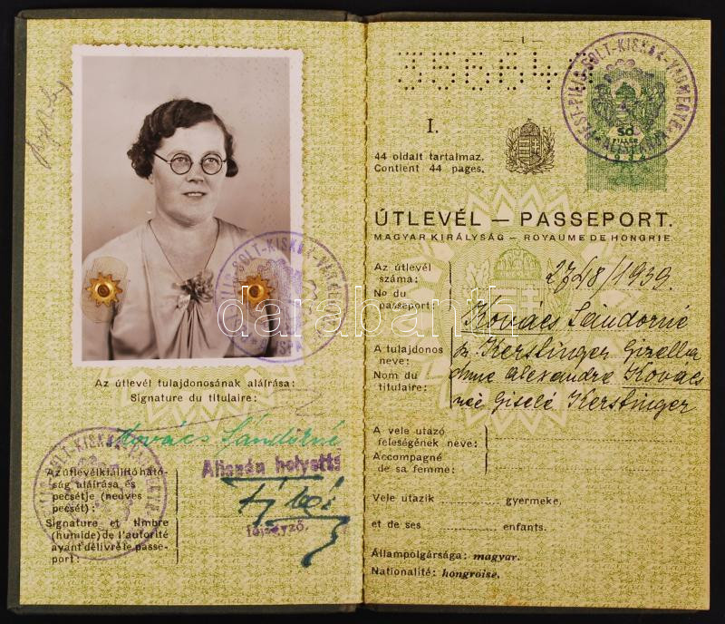 Beschreibung: 1939, Útlevél, vízumpecsétekkel és bejegyzésekkel,