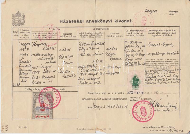 Beschreibung: 1940 Házassági anyakönyvi kivonat okmánybélyeg + Szeged városi okmánybélyeg vegyes díjlerovással