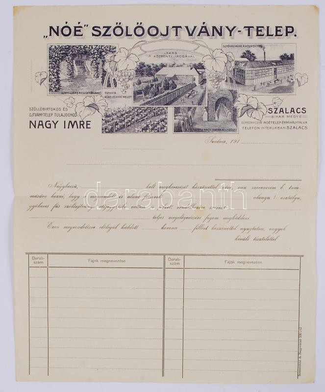 cca 1910. Számla, Szalacs. "Nóé Szőlőojtvány-telep". Fejléces, kitölte... https://www.darabanth.com/de/195-Fernauktion/195.0/Andere-Sammelgebiete/Dokument~800014/cca-1910-Szamla-Szalacs-Noe-Szoloojtvany-telep-Fejleces-kitoltetlen-28x22-5-cm~II748036