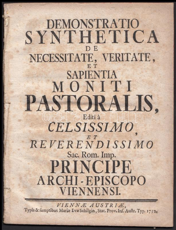 Beschreibung: 1752 Demonstratio synthetica de necessitate, veritate, et sapientia moniti pastoralis. Editi a... Sac. Rom. Imp. Principe Archi-Episcopo Viennensi. Viennae Austriae, typ. Mariae Evae Schilgin.