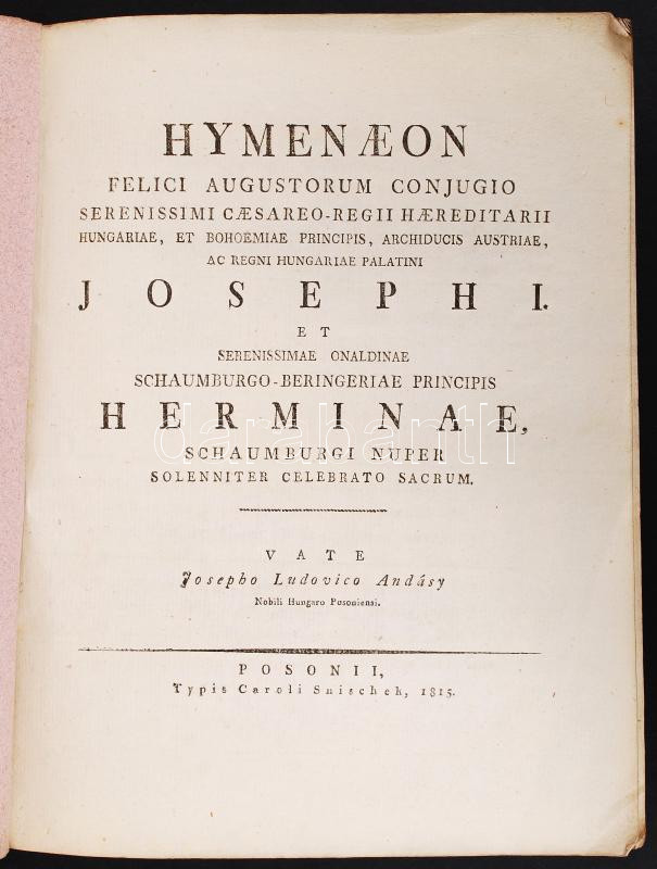 1815 Hymenaeon felici augustorum conjugio... ac regni Hungariae palatini Josephi... vate Josepho Ludovico Andásy. Posonii, 1815, typ. Caroli Snischek. Díszes papírborítóban, a szövegben két vignettával (a borító hátul sérült)
