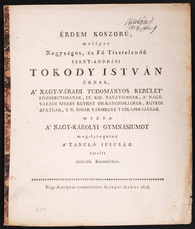 1822 Érdem koszorú, mellyet Nagyságos, és Fő Tisztelendő szent-andrási Tokody István úrnak... midőn a' nagy-károlyi gymnásiumot meg-látogatná a' tanuló ifiúság emeltt... Nagy-Károlyban, nyom. Gőnyei Gábor