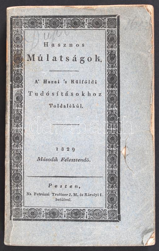 1829 Hasznos Múlatságok, a' Hazai 's Külföldi Tudósításokhoz Toldalékúl. Második Félesztendőre (1-52. szám). Korabeli papírkötésben (a kötés sérült, egyébként jó állapotú)