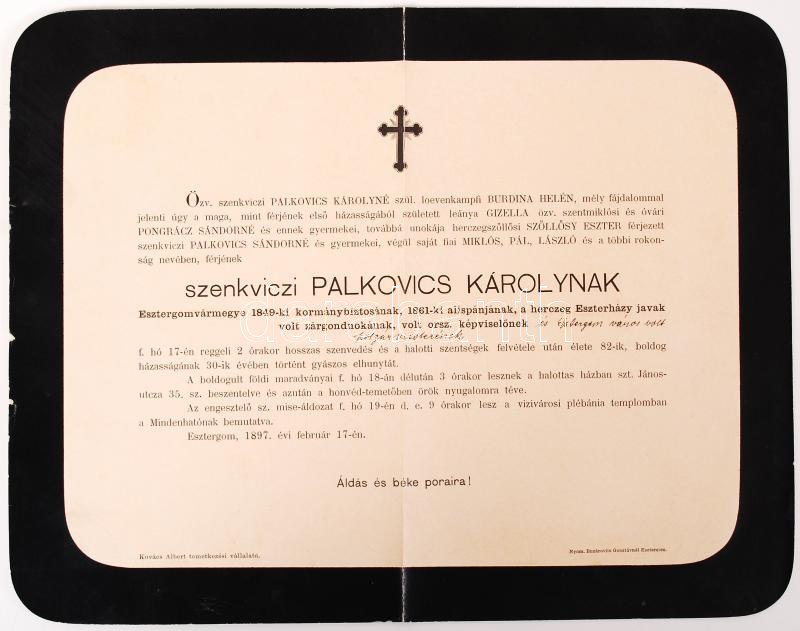 1897 Szenkviczi Palkovics Károly Esztergomvármegye 1849-ki kormánybiztosának, 1861-ki alispánjának, a herczeg Eszterházy javak volt zárgondnokának, volt orsz. képviselőnek gyászjelentése