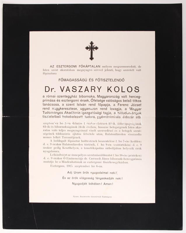 1915 Vaszary Kolos bíbornok, volt hercegprímás, esztergomi érsek gyász... https://www.darabanth.com/de/195-Fernauktion/195.0/Andere-Sammelgebiete/Drucksachen~800026/1915-Vaszary-Kolos-bibornok-volt-hercegprimas-esztergomi-ersek-gyaszjelentese~II745052