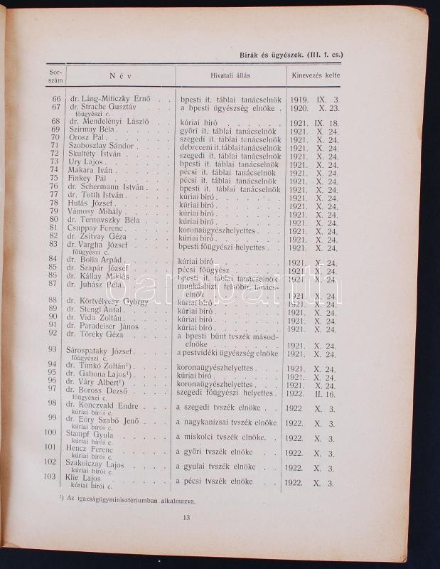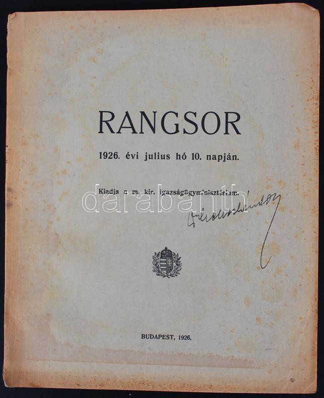 1926 Rangsor: Az igazságügyi dolgozók, bírák ügyészek rangsora. Kiadja... https://www.darabanth.com/de/195-Fernauktion/195.0/Andere-Sammelgebiete/Drucksachen~800026/1926-Rangsor-Az-igazsagugyi-dolgozok-birak-ugyeszek-rangsora-Kiadja-a-M-kir-Igazsagugy~II749775
