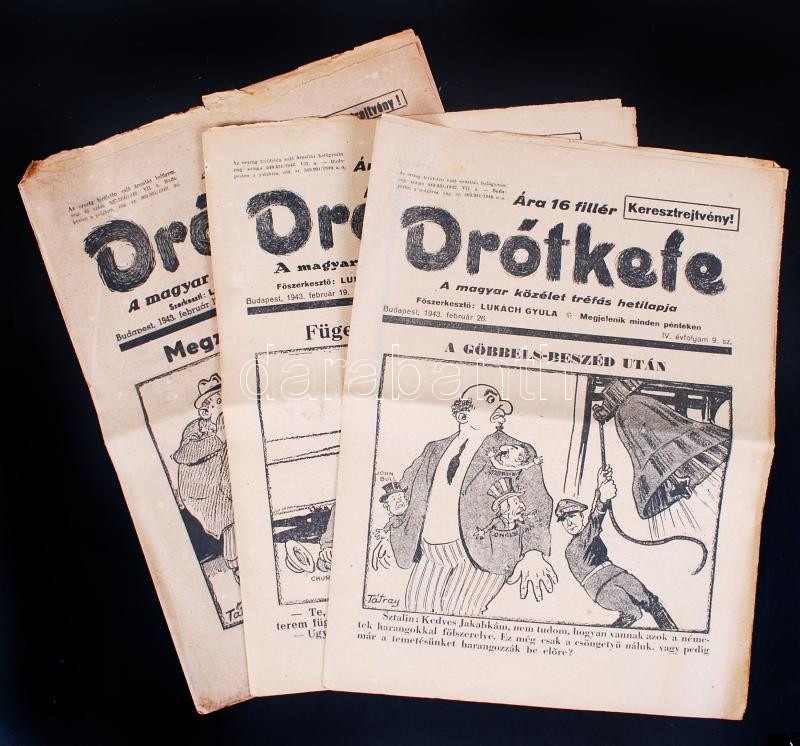 1943 A Drótkefe c. élclap 3 száma jó állapotban https://www.darabanth.com/de/195-Fernauktion/195.0/Andere-Sammelgebiete/Drucksachen~800026/1943-A-Drotkefe-c-elclap-3-szama-jo-allapotban~II749731