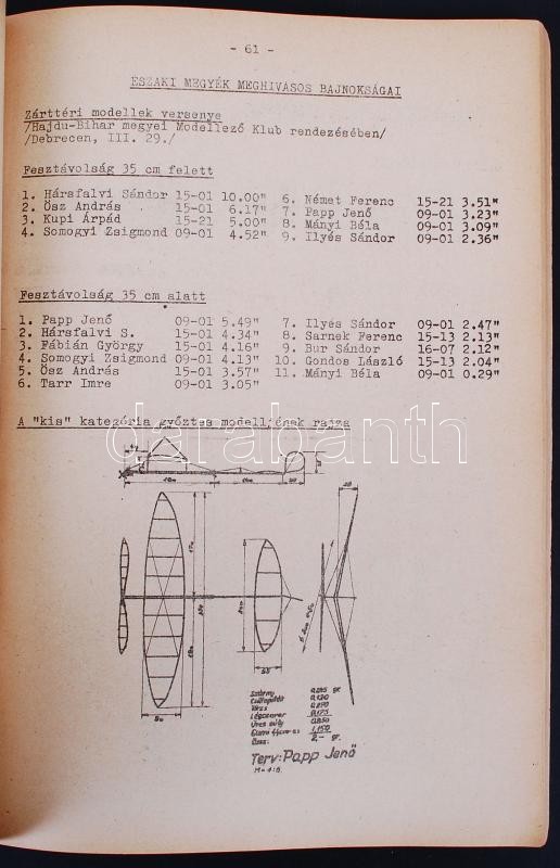 1960 A Magyar Honvédelmi Sportszövetség repülő-, hajó- és autómodell versenyeinek évkönyve. Összeállította: Frigyes Ernő. Bp., A Magyar Honvédelmi Sportszövetség Modellezési Osztálya, 241p. Papírkötés, viseltes, javított