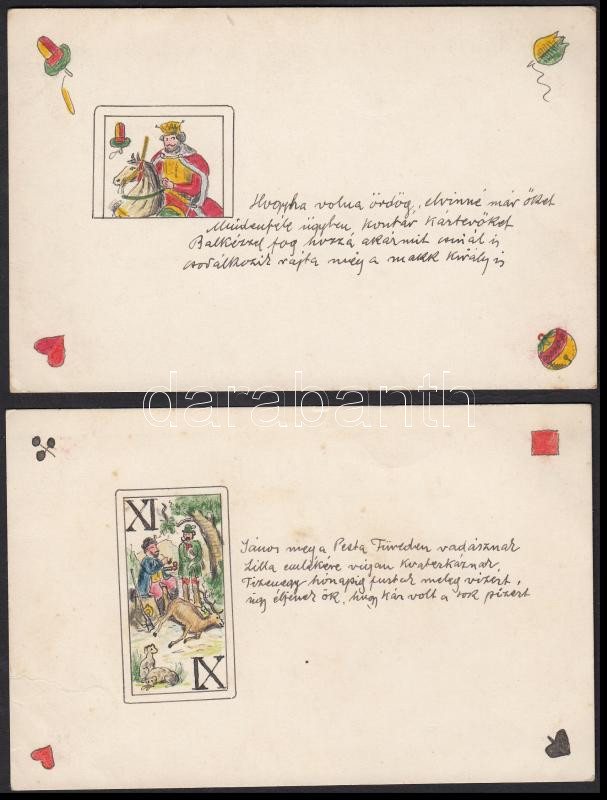 Beschreibung: 2 db rajzos, kártya témájú lap humoros, verses szöveggel