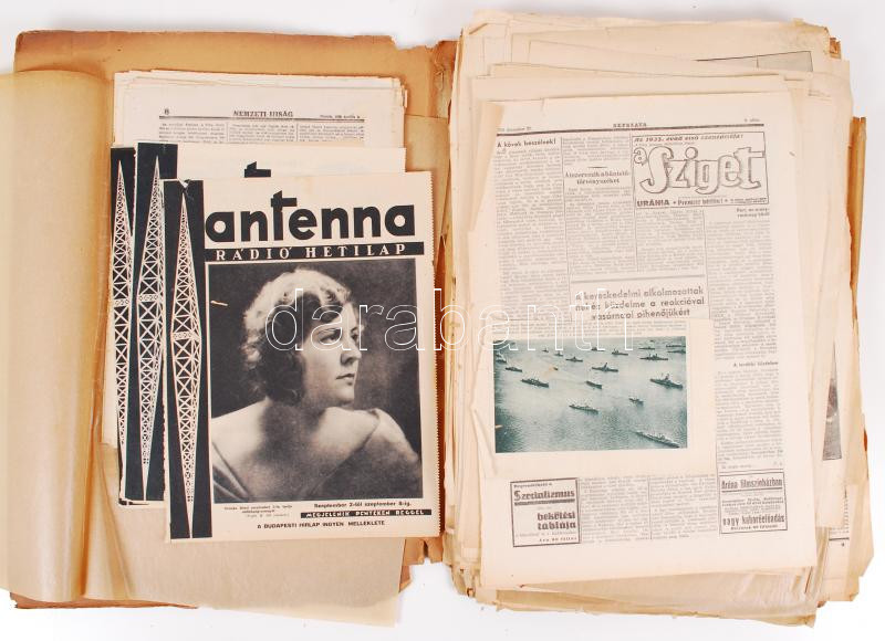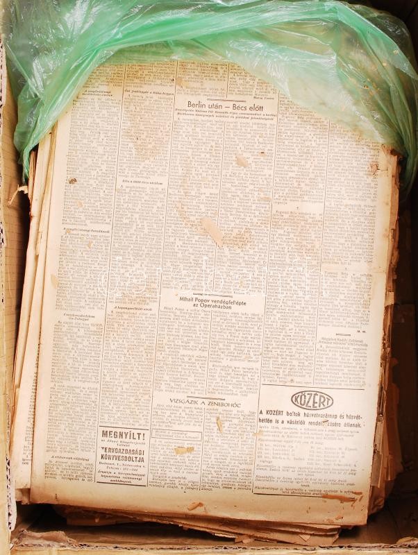 cca 1930 Nagy doboznyi nyomtatvány több száz régi újság, újságkivágás sok érdekességgel (közlekedési témájú cikkek, képek a zeppelin építéséről, légi felvételek Magyarországról, hirdetések stb.), Pesti Napló, Budapesti Hirlap, Népszava, néhány The New York Times etc., 8,5kg anyag