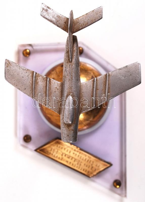 Beschreibung: 1968 Szovjet ajándéktárgy "Magyar Barátomnak..." kezdetű cirill betűs felirattal, réz, plexi, rácsavarozható MIG-15-ös vadászgéppel /