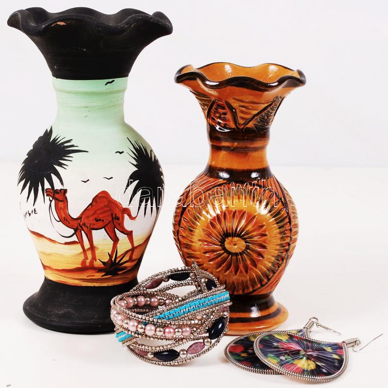 Beschreibung: Arab kerámia vázák, hibátlanok, selyem-fém fülbevaló pár, bizsu karkötő