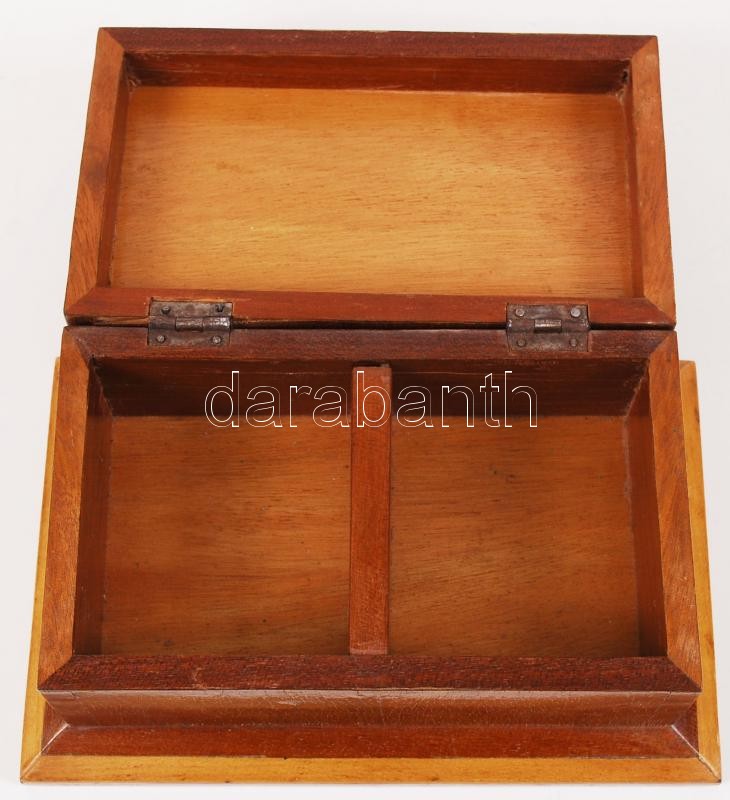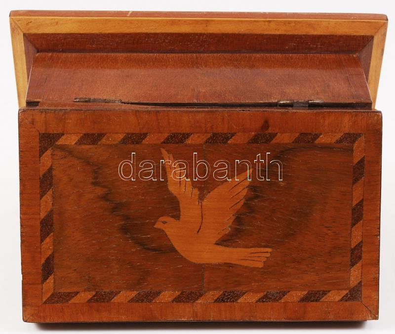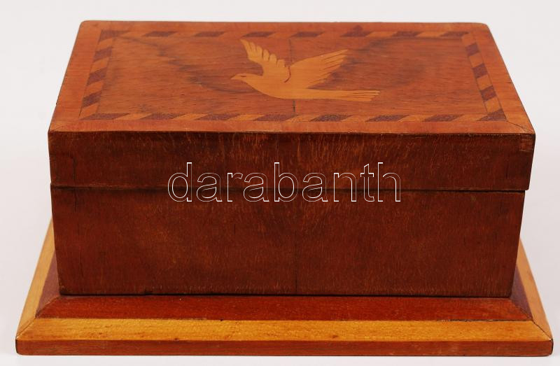 Beschreibung: Intarziás asztali fadoboz, madár mintával, hibás és javított. 20x13 cm, magasság: 9 cm
