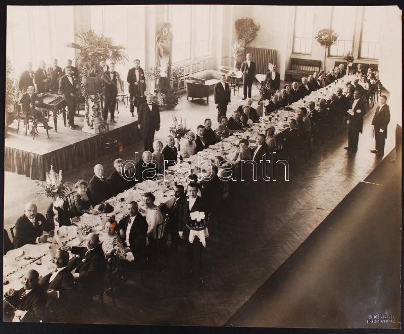 Beschreibung: 1910-1920 Esküvői ebéd, társasági esemény a szombathelyi Knébel Fotótól, hátoldalán nehezen olvasható, halvány felirat, hidegpecsét elől, 27x33cm