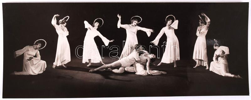 Beschreibung: 1929 Szentpál Olga tánccsoportja Bethlen Margit egy pantomimjátékát adja elő, hátoldalán feliratozott, 6x16cm