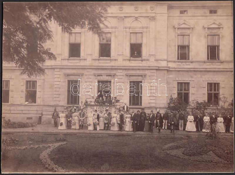 Beschreibung: Cca 1890-1900 Főúri vendégek egy esküvőn, ismeretlen kastély parkjában 18x24 cm