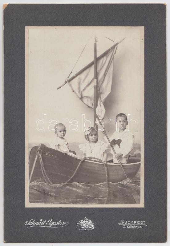 cca 1900-1910 Schmidt Ágoston: Balatoni vitorláshajó díszlete egy budapesti műteremben; gyermekfotó, vintage kép, kartonra ragasztva, képméret 19x12 cm, karton 25x17 cm