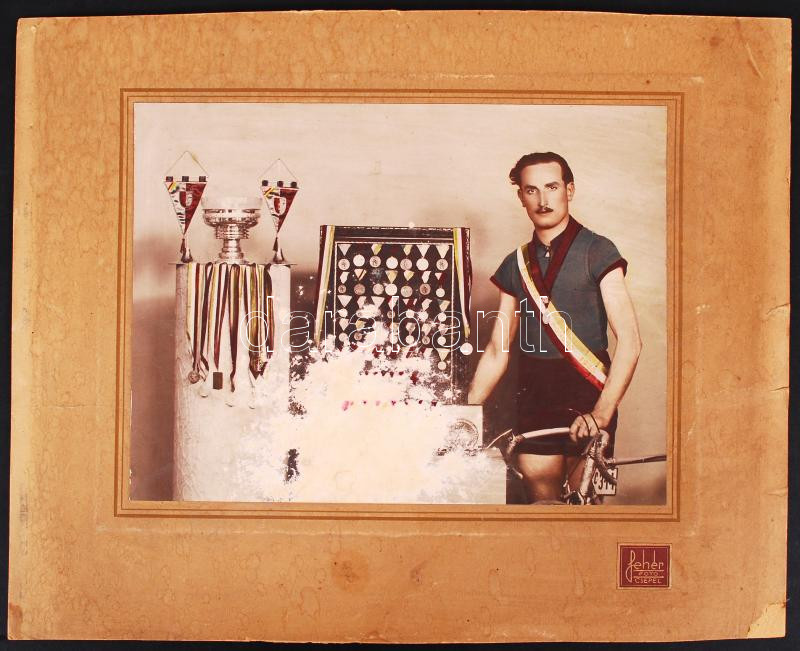 Beschreibung: cca 1920-1940 Kerékpáros versenyző az érmeivel a csepeli Fehér Fotótól. Hibás, egy részén lekopott az emulzió, kézzel színezett, 17x23/27x34cm